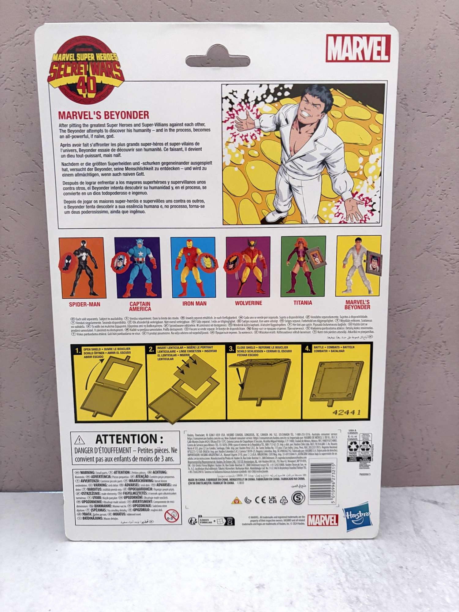 Each figure’s card back has a bio on the character, along with instructions on how to place the Marvel Super Heroes Secret Wars 40th Anniversary card inside the shield.
