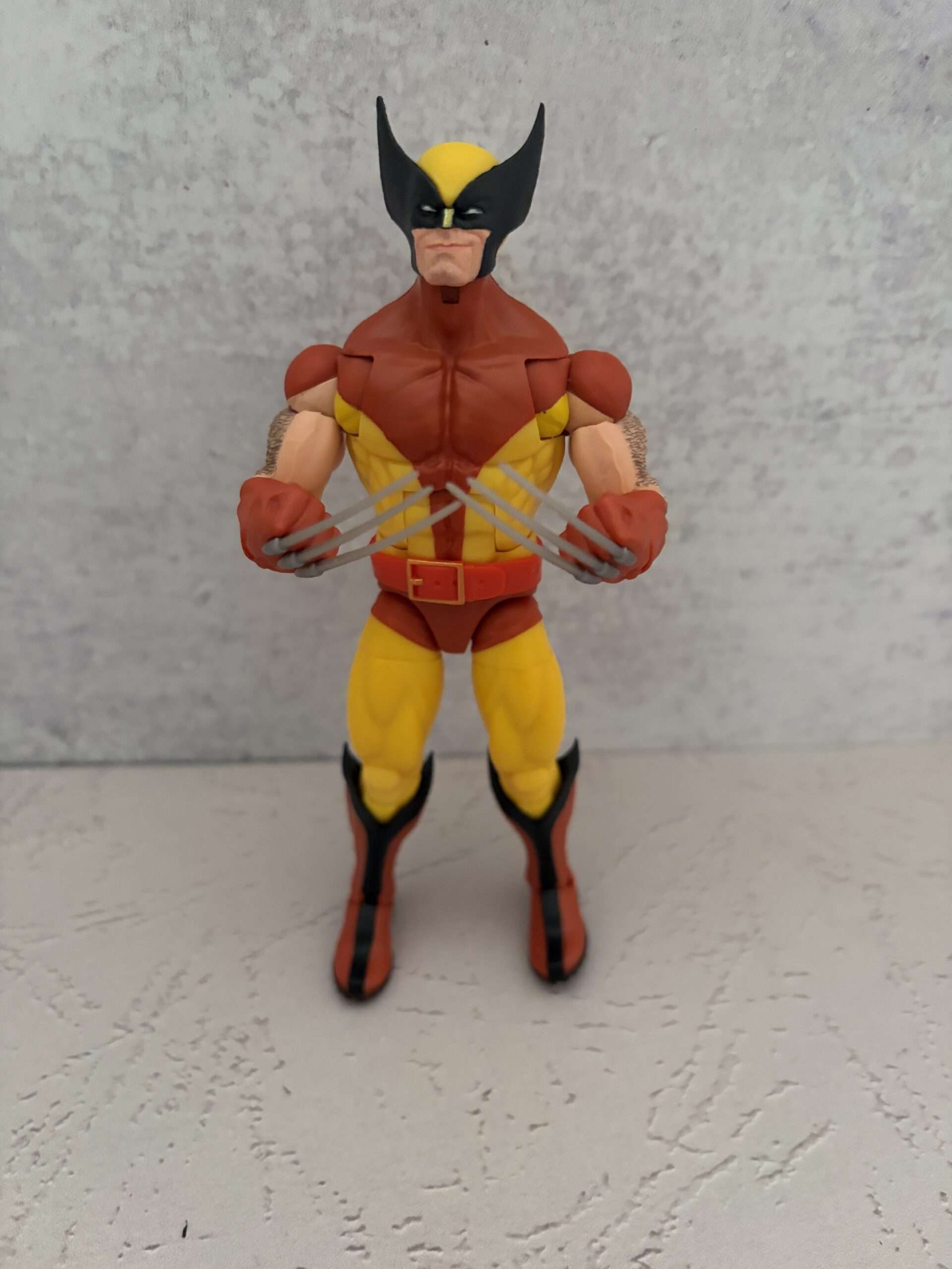 Wolverine not only sports his classic brown and yellow costume from the ’80s, but he comes with a separate Logan head and two perfectly posed sets of hands.