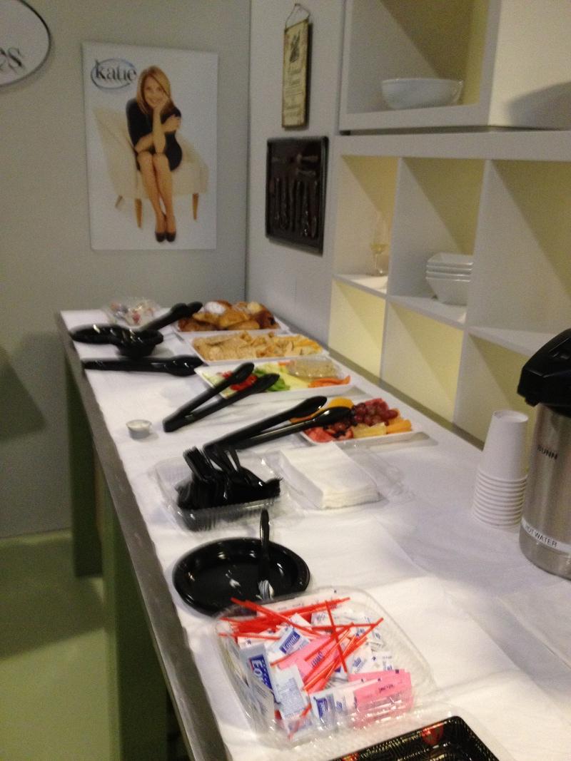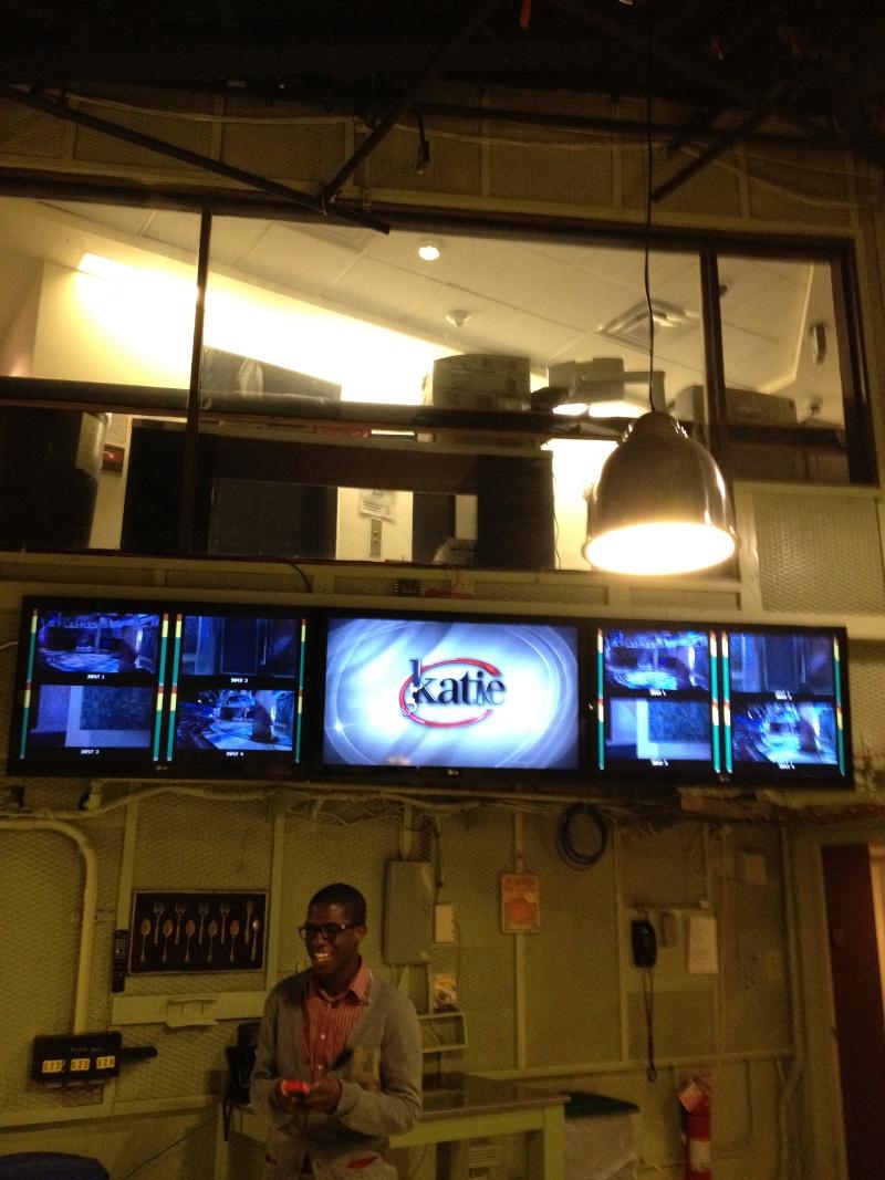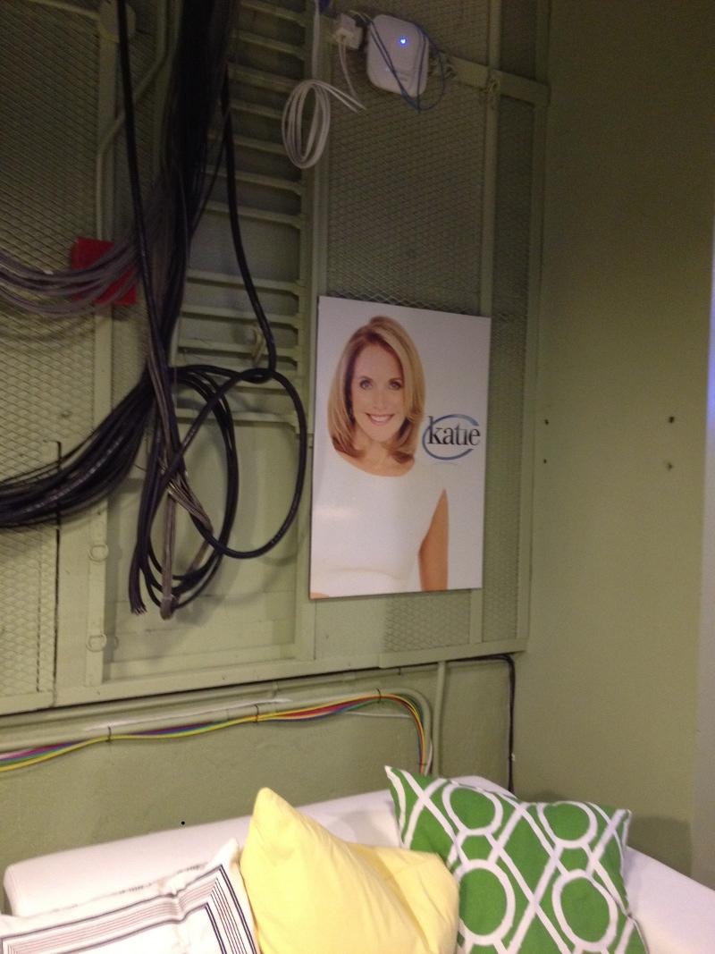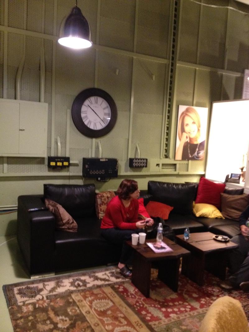 My first impression of the green room was that, yes, it actually was green! In my head, I pictured a green room as a small room with a couch, some food and a big TV. This was more of a huge loft, broken up into various sections. Tons of homey decorations adorned the walls, along with oodles of photos of Katie Couric. There were also a bunch of couches, tables, TVs, and a whole monitor section showing all the various camera angles from the set.