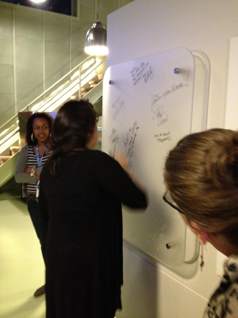 E L James signing Katie Couric’s “Signature Board” in the green room.