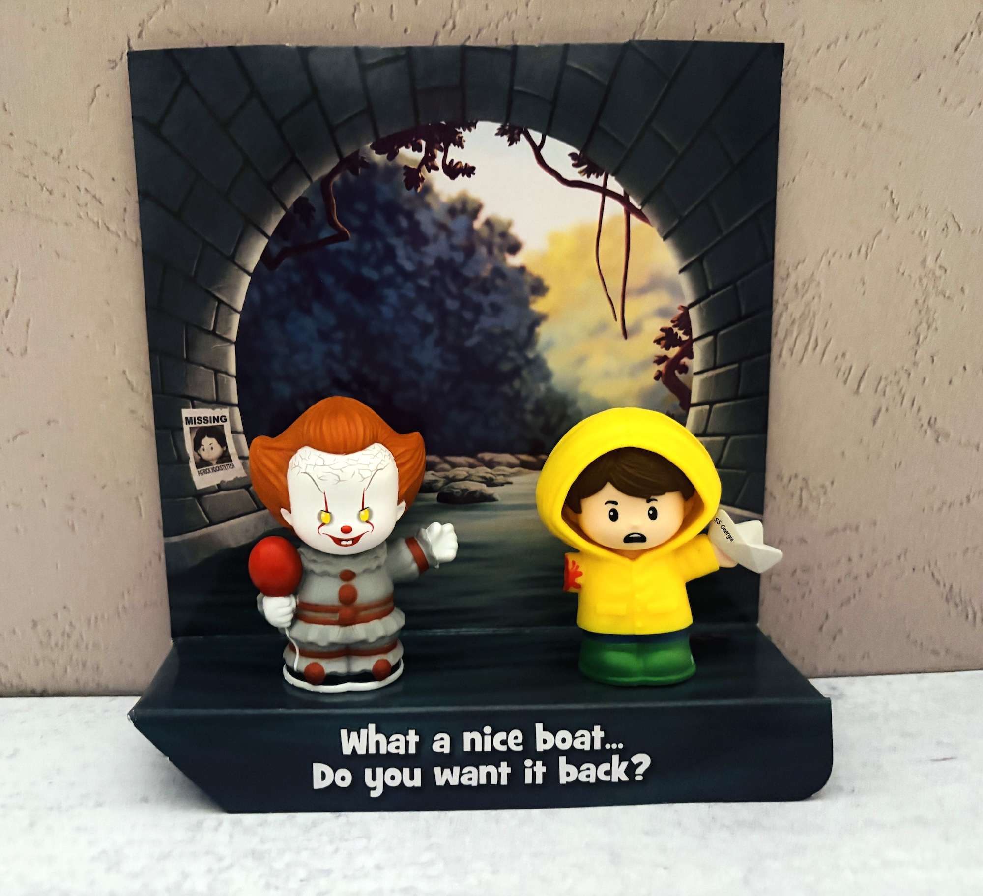 So forgive me if I’m a bit shocked that Fisher-Price would put out a collector’s version of Little People based on the IT movie. Pennywise himself seems innocuous enough. Adorably evil is certainly how I’d describe him with his buck teeth, fierce yellow eyes and traditional red balloon.